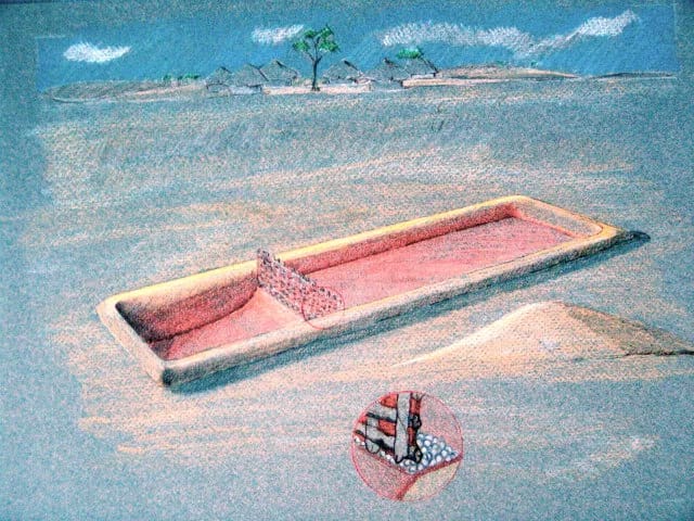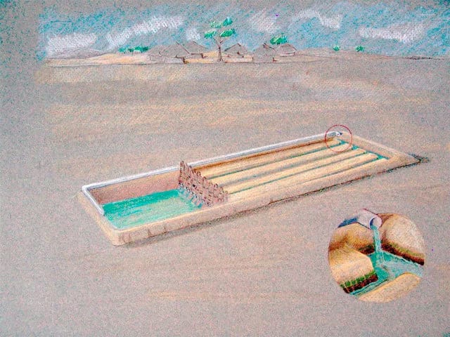 The reddish tint in the image represents a liner of expansive clay (where available) as an alternative to synthetic membrane for water retention. The weir could be woven stick and thatch, or brick/rock wall, scrap tin, logs & mud, boards……whatever is available. Many alternative configurations…..both low/hi-tech are possible.