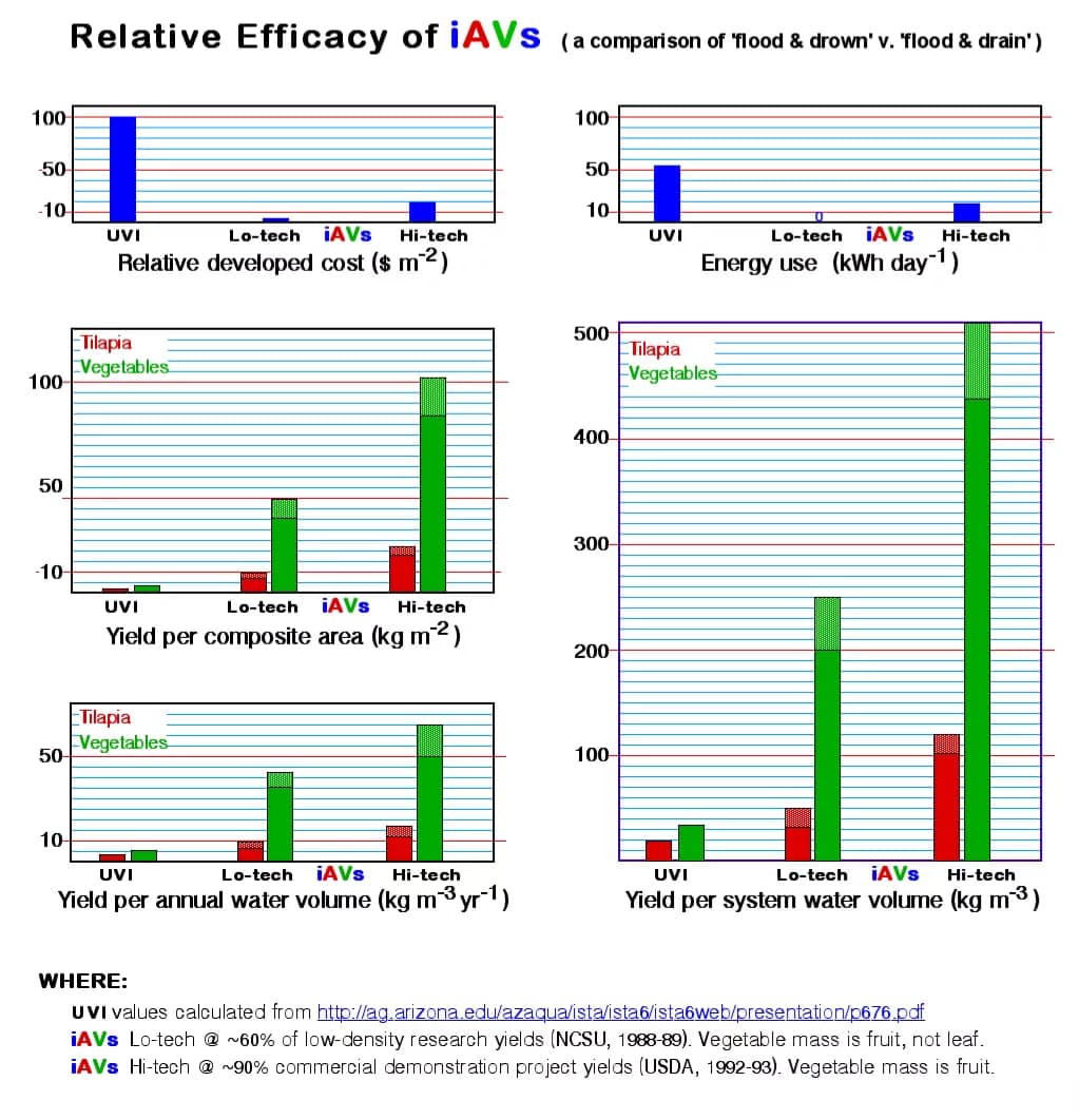 The net result is that UVI/DWC is nowhere nearly as efficient as iAVs is in either resource utilization or in food value produced per unit area, volumes, and (or) time. Which is to say nothing of any alleged profitability in a commercial context or viability in a third-world village.