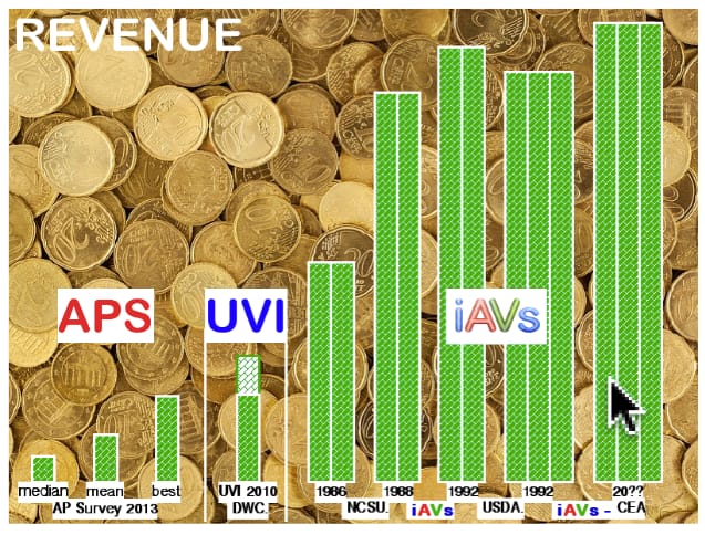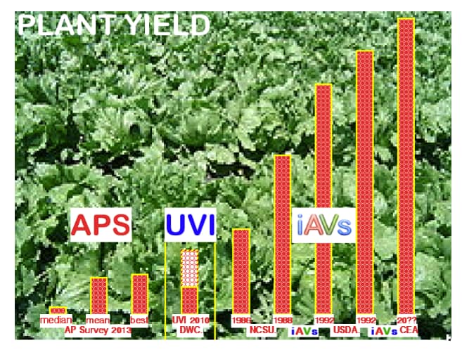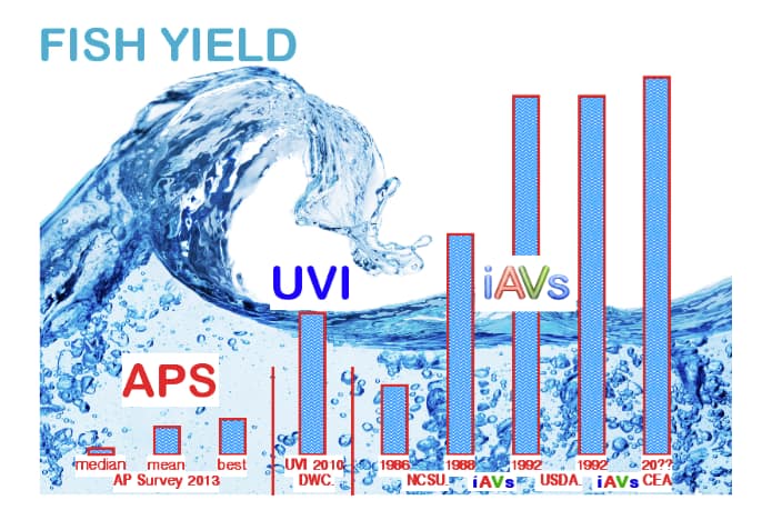 Graphical representations (below) comparing iAVs research and commercial demonstration results with UVI’s ‘best’ yields (2010 report) and to the ‘finding’ of a (so-called) “Commercial Aquaponics Survey” [APS] conducted in 2013 out-of John Hopkins University.