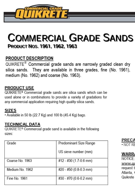 QUIKRETE® All-Purpose Sand (No. 1152) is a washed, properly graded coarse sand with multi-purpose uses. Meets ASTM C 33 specifications.